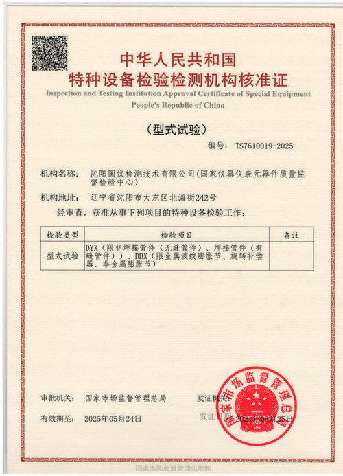 經(jīng)國家市場監(jiān)督管理總局審查,獲準(zhǔn)從事DYX(限非焊接管件(無縫管件)、焊接管件(有縫管件))、DBX(限金屬波紋膨脹節(jié)、旋轉(zhuǎn)補(bǔ)償器、非金屬膨脹節(jié))特種設(shè)備型式試驗檢驗工作。